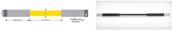 Over size cold ends are therefore no longer necessary, the old style resistance ratio was 1:3, whereas the new DB resistance ratio is 1:40. Maximum temperature is 1550 deg. C. (For Dimensions, Resistance, etc. kindly contact us).