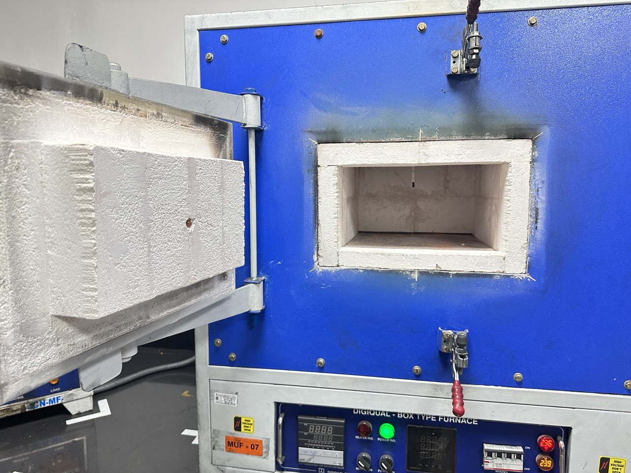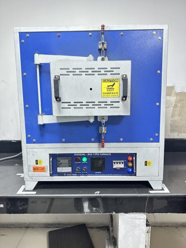 Digiqual 1400°C Muffle Furnace Construction comprises of double walled chamber, outer made of cold rolled mild steel sheets and finished in powder coating paint. inner chamber formed by High temperature withstand zirconia vacuum board followed by ceramic fibre blankets on all the sides. double walled door mounted on heavy-duty hinges in the front is provided with effective locking arrangements. optionally, the door can be provided with door limit switch to cut off the power supply whenever the door is opened and to restart when the door is closed.