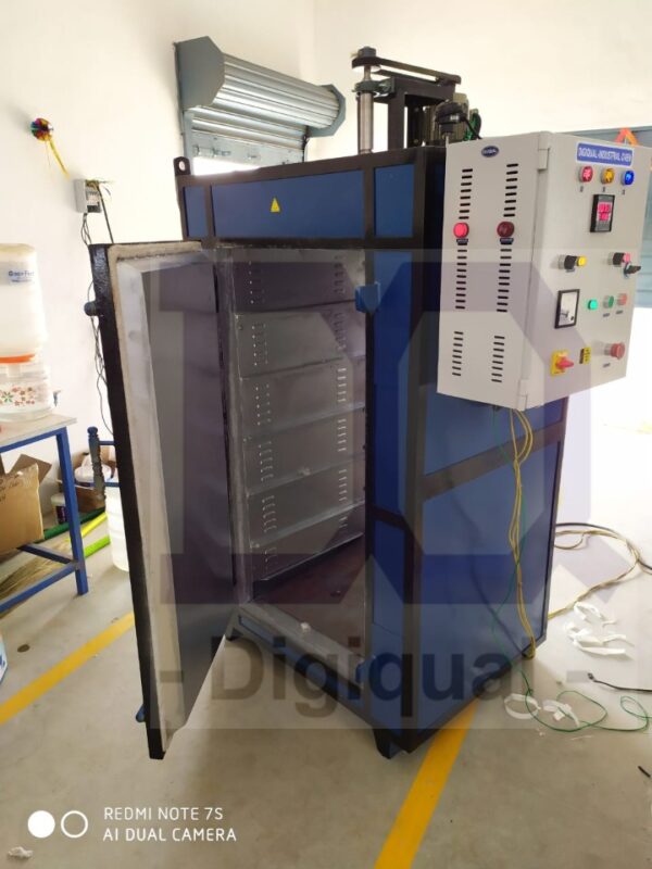 Digiqual Manufacturers Industrial Tray Drier Consist of a Triple Walled chamber. The Inner chamber fabricated out of Mild Steel Or 304 Grade Stainless steel sheet. The Middle And outer chamber is made of mild steel. The inter space in between the walls is tightly packed with special grade glass wool insulation to eliminate radiation heat loss to a minimum.