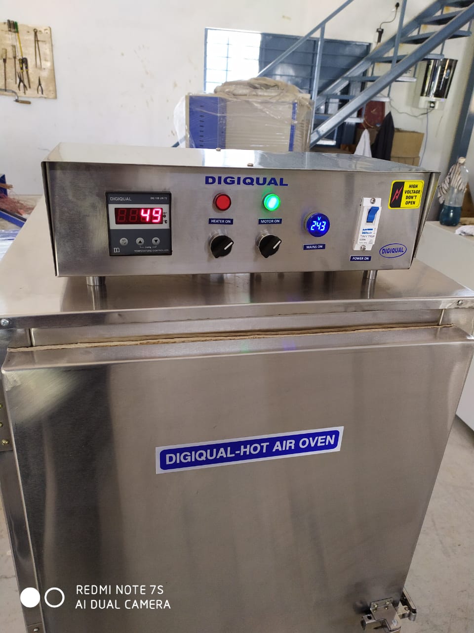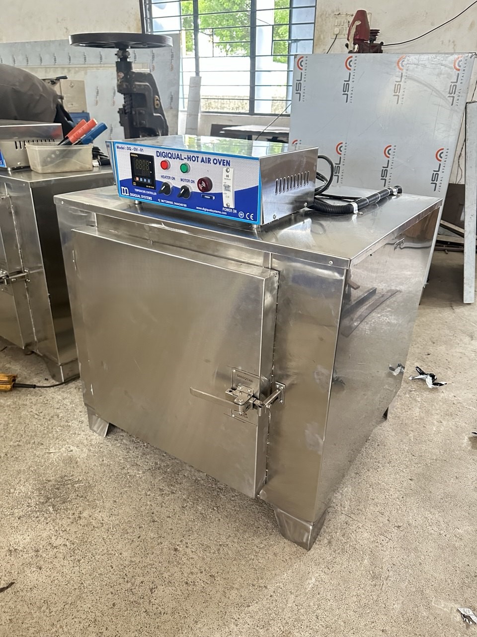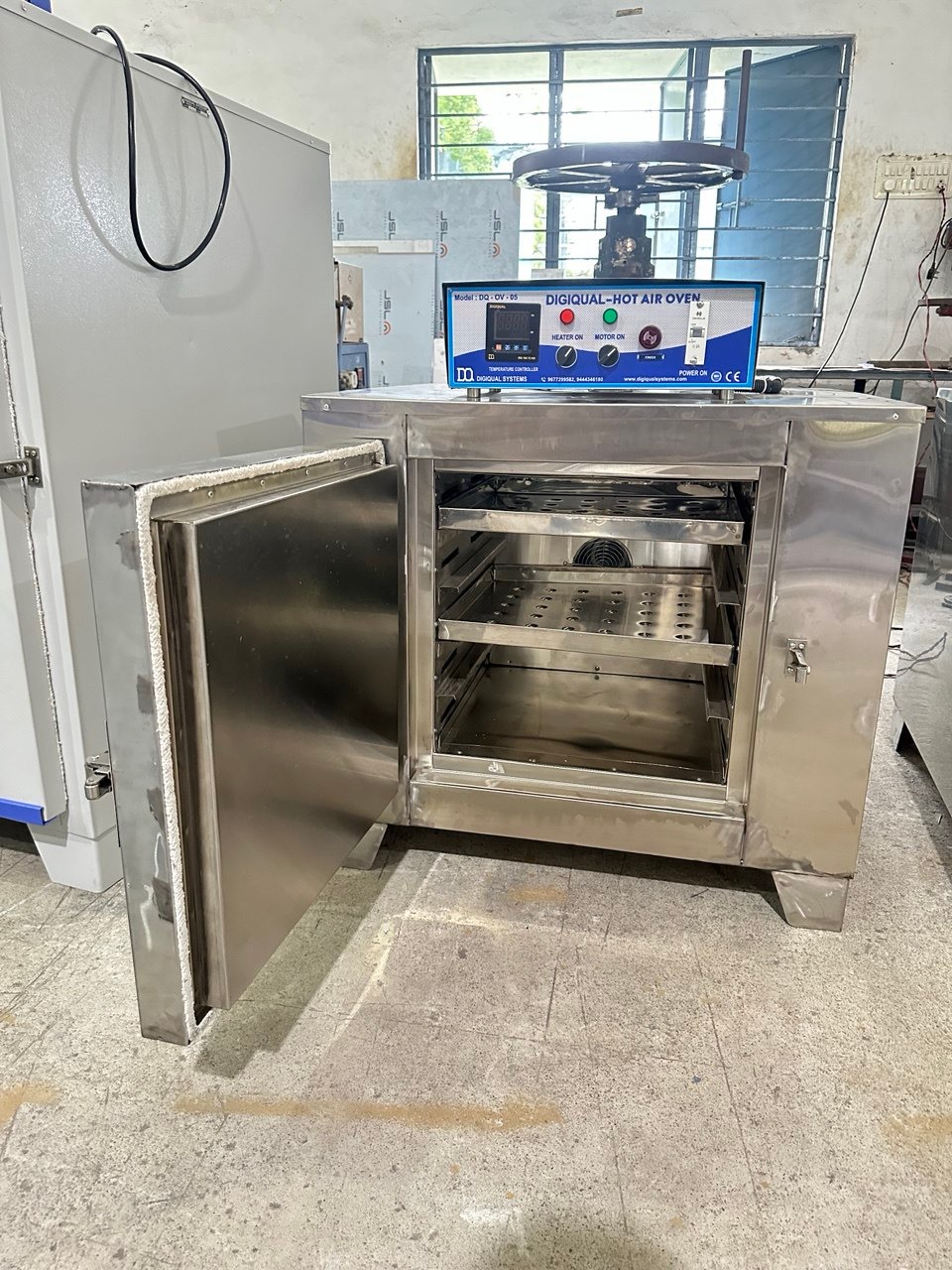 Digiqual Systems Manufacturers Stainless Steel ( SS ) Laboratory Hot Air Oven . Inter space in between the outer and middle wall is tightly packed with special grade glass wool. the outside skin temperature will be around 20 top 30 degs C above ambient. The oven will be provided with required number of adjustable Trays.